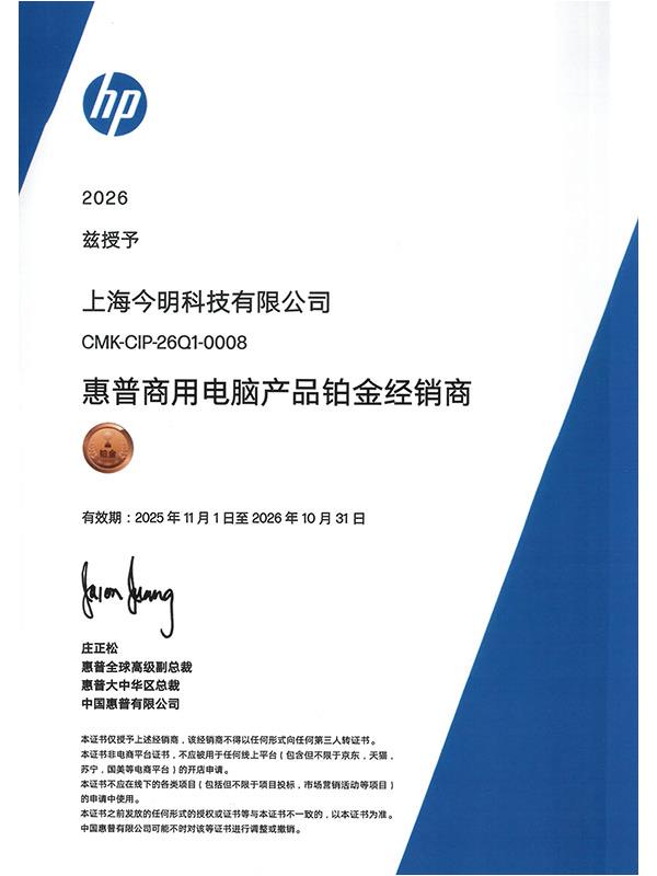 查看詳情惠普商用電腦產品鉑金經銷商證書-今明科技2026